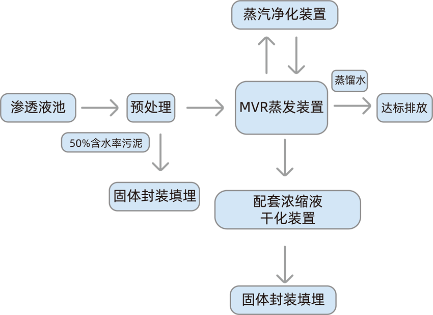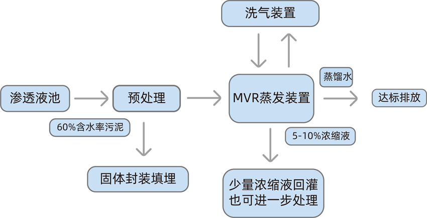 垃圾滲濾液工藝是針對其廢水特點,通過MVR節(jié)能蒸發(fā)、蒸汽凈化等技術途徑,實現垃圾滲濾液的零回灌或少量(10%左右)濃縮液回灌要求,最終形成達標排放的蒸餾水。